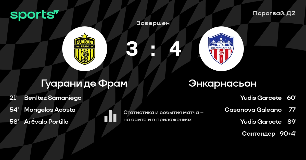 Engel Thiago Steffen Ayala - Abel Rodrigo Brítez Rojas, Rolando Vidal Vázquez Insurralde, Легисамон, Diego Iván Villalba Caballero, Rodolfo Argüello Balbuena - Диас, Давалос, Vega - Franco Emiliano Pelozo, EscobarЗапасные: Núñez Portillo, Rojas Coronel, Yudis Garcete, Vera Franco, Casanova Galeano, Сантандер, Báez Martínez