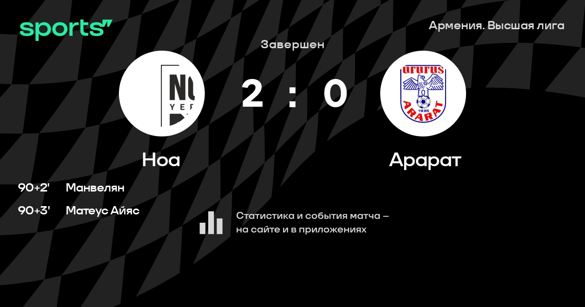 Результат прошлой игры в турнире «Высшая лига»: Ноа – Ван 2:1. После 6 туров Ноа набирает 13 очков и занимает 4 место в турнире. Лучший бомбардир команды – Имран Аулад: он забил 3 в 8 матчах. Ноа не проигрывает в 3 последних матчах в рамках турнира «Высшая лига». В 3 последних матчах в турнире «Высшая лига» Ноа обязательно забивает. Ноа пропускает в 5 последних матчах в турнире «Высшая лига». В последних 5 играх Ноа забивает 10 голов. В последних 5 играх Ноа пропускает 8 голов.