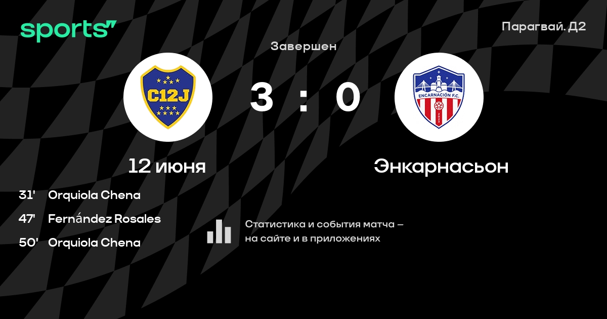 Результат прошлой игры в турнире «Сегунда»: 12 июня – Спортиво Сан-Лоренсо 1:1. После 26 туров 12 июня набирает 43 очков и занимает 3 место в турнире. Лучший бомбардир команды – Сантьяго Сальседо: он забил 10 в 22 матчах. 12 июня не может выиграть в 4 последних матчах в рамках турнира «Сегунда». 12 июня пропускает в 4 последних матчах в турнире «Сегунда». В последних 5 играх 12 июня забивает 5 голов. В последних 5 играх 12 июня пропускает 6 голов.