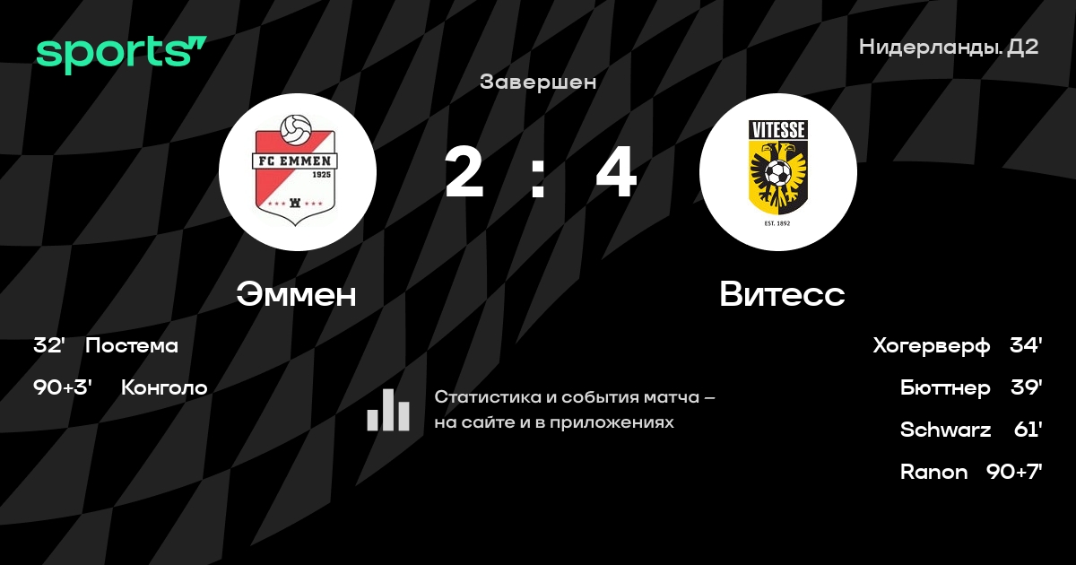 Результат прошлой игры в турнире «Первый дивизион»: Витесс – Виллем II 1:2. После 4 туров Витесс набирает -8 очков и занимает 20 место в турнире. Лучший бомбардир команды – Марко Шикора: он забил 2 в 4 матчах. В 3 последних матчах в турнире «Первый дивизион» Витесс обязательно забивает. Витесс пропускает в 7 последних матчах в турнире «Первый дивизион». В последних 5 играх Витесс забивает 5 голов. В последних 5 играх Витесс пропускает 12 голов.