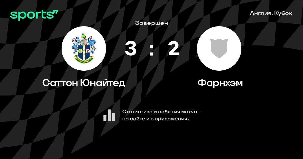 Результат прошлой игры в турнире «Кубок»: Фарнхэм – Саттон Юнайтед 3:3. В последних 5 играх Саттон Юнайтед забивает 6 голов. В последних 5 играх Саттон Юнайтед пропускает 7 голов.