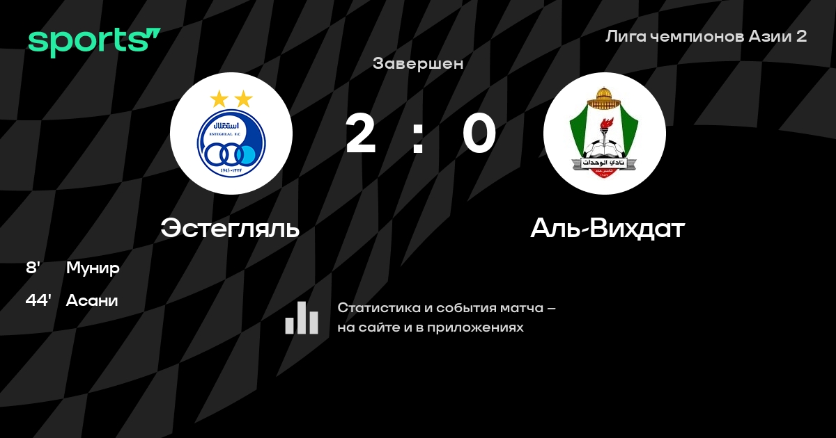 Результат прошлой игры в турнире «Лига чемпионов Азии 2»: Эстегляль – Аль-Мухаррак 0:1. В последних 5 играх Эстегляль забивает 5 голов. В последних 5 играх Эстегляль пропускает 5 голов.