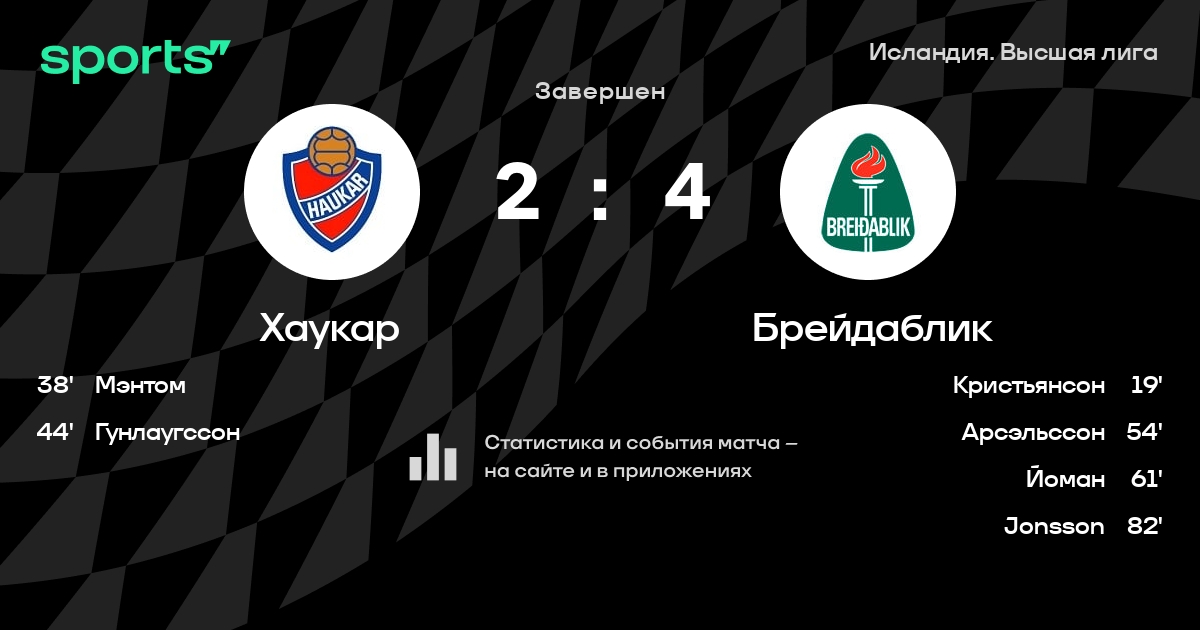Ларуссон - Vidar Mete, Björnsson, Pálsson, Einarsson - Людссон, Мэнтом, Jóhannsson - Ásgeirsson, Eidsson, ГунлаугссонЗапасные: Mehica, Grétarsson, Jónsson, Einarsson, Ingólfsson, Sæmundsson, Gíslason