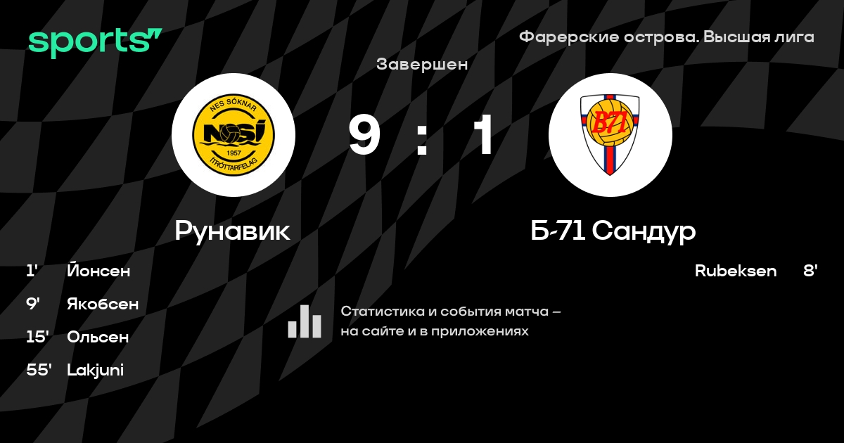 Ганго - Фредериксберг, Хансен, Давидсон, Йонсен - Петерсен, Лечин, Hansen - Якобсен, Ольсен, á LakjuniЗапасные: Юнсен, Даниэльсен, Мортенсен, Danielsen, Фредериксберг