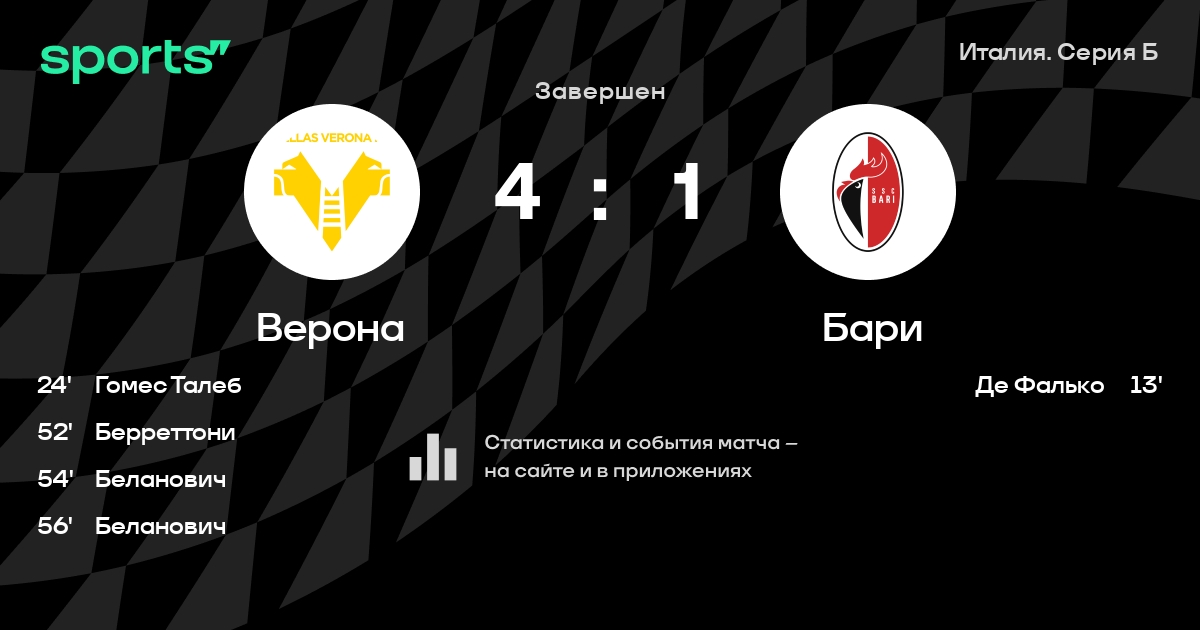 Италия. Серия B. 35-й тур. «Верона» разгромила «Бари» и другие матчи