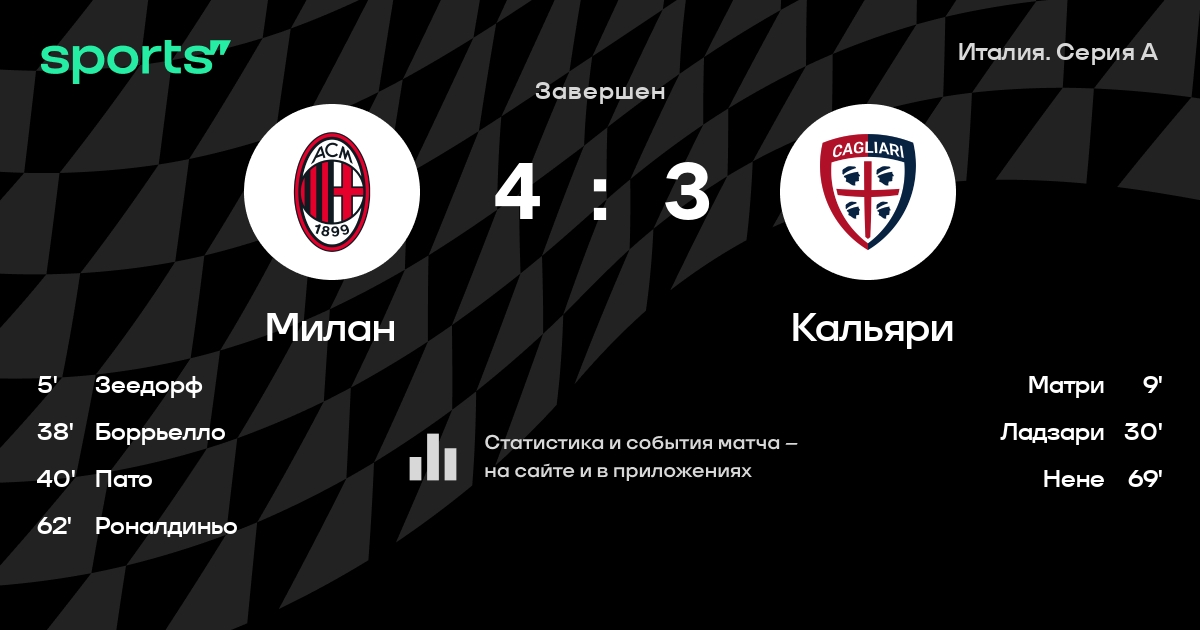 Дида - Оддо, Тиаго Силва, Каладзе, Дзамбротта - Амброзини, Зеедорф, Роналдиньо, Пирло - Пато, БоррьеллоЗапасные: Сторари, Антонини, Фавалли, Страссер, Хунтелар