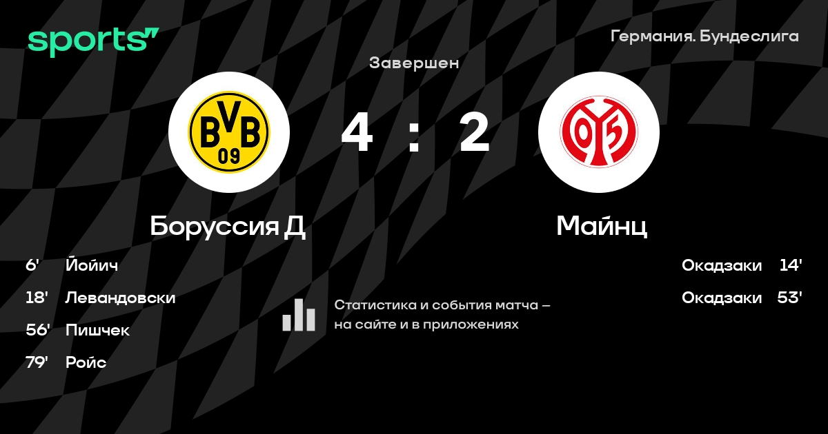 Лэнгерак - Дурм, Хуммельс, Папастатопулос, Пишчек - Мхитарян, Ройс, Йойич, Шахин, Кирх - ЛевандовскиЗапасные: Аломерович, Гросскройтц, Сарр, Фридрих, Хофманн, Шибер, Обамеянг
