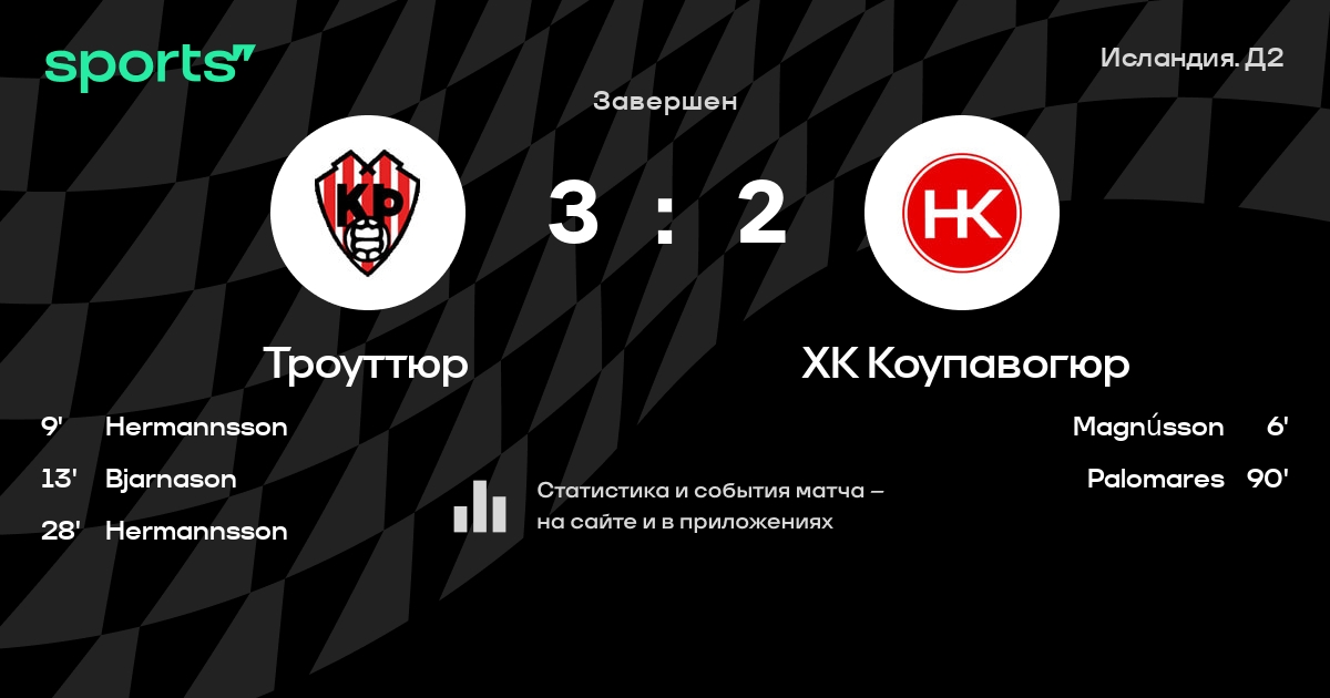 Бьорнссон - Sveinsson, Bjarnason, Lárusson, Ómarsson, Gudmundsson - Hilmisson, Ólason, Ivkovic - Hermannsson, VilhjálmssonЗапасные: Thórarinsson, Pálsson, Magnússon, Tanasić, Sadikovic
