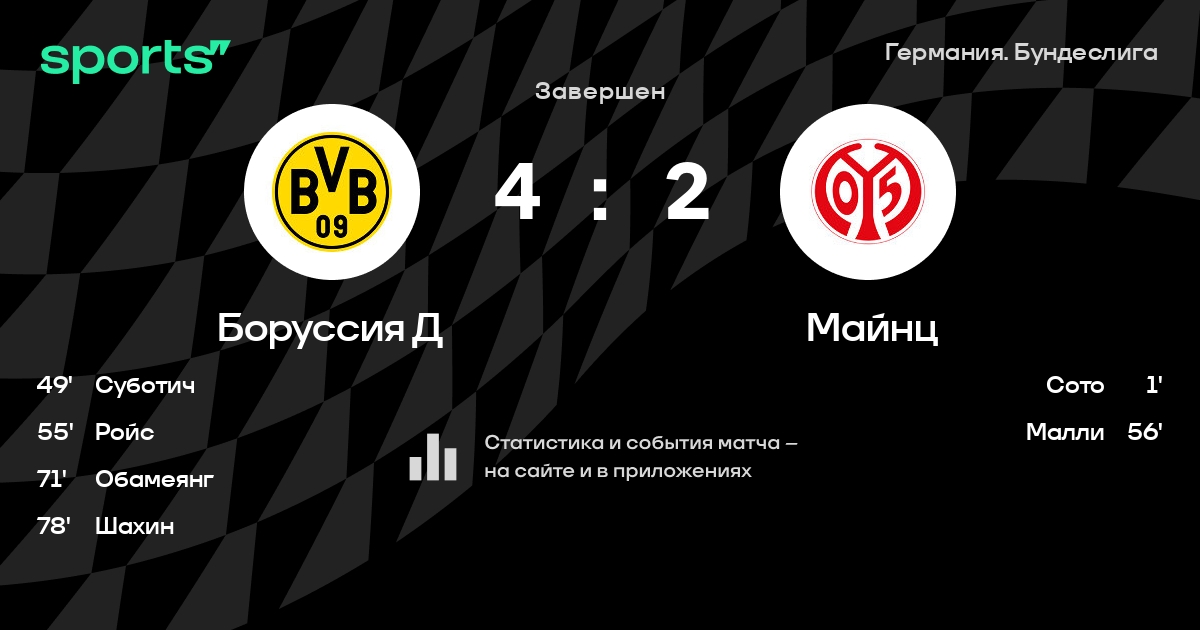Вайденфеллер - Шмельцер, Папастатопулос, Суботич, Пишчек - Шахин, Гюндоган, Ройс, Кагава, Кампль - ОбамеянгЗапасные: Лэнгерак, Гинтер, Йойич, Мхитарян, Иммобиле, Рамос