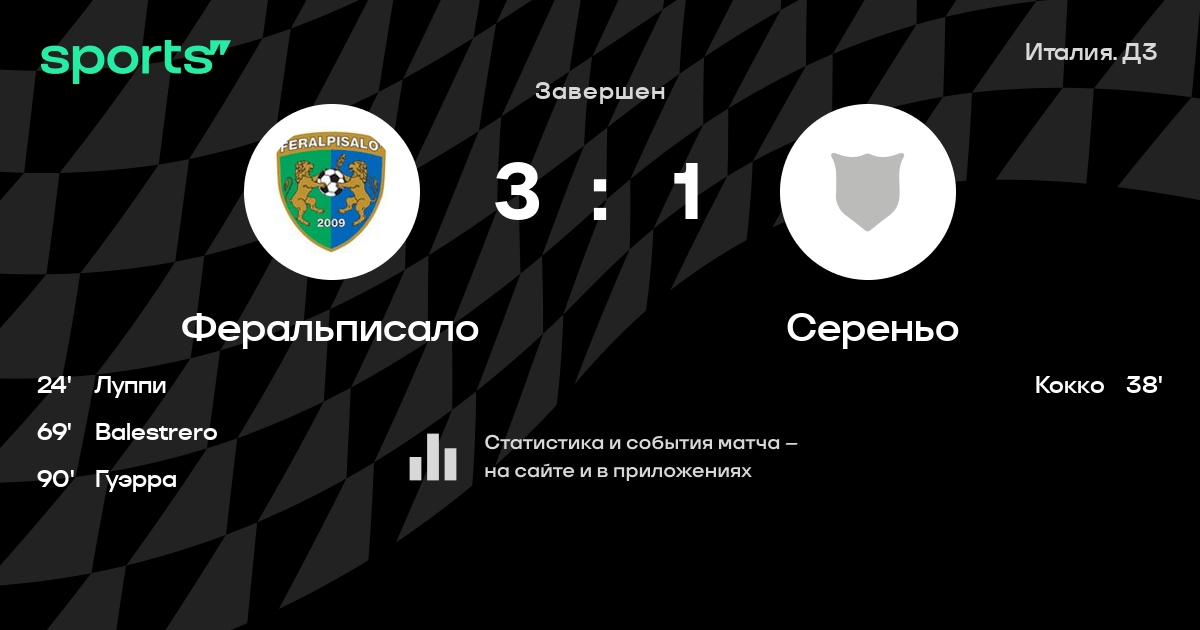 Результат прошлой игры в турнире «Италия. Д3»: Сереньо – Фьоренцуола 0:0. После 22 туров Сереньо набирает 24 очков и занимает 14 место в турнире. Сереньо не может выиграть в 5 последних матчах в рамках турнира «Италия. Д3». В 3 последних матчах в турнире «Италия. Д3» Сереньо обязательно забивает. В последних 5 играх Сереньо забивает 2 голов. В последних 5 играх Сереньо пропускает 7 голов.
