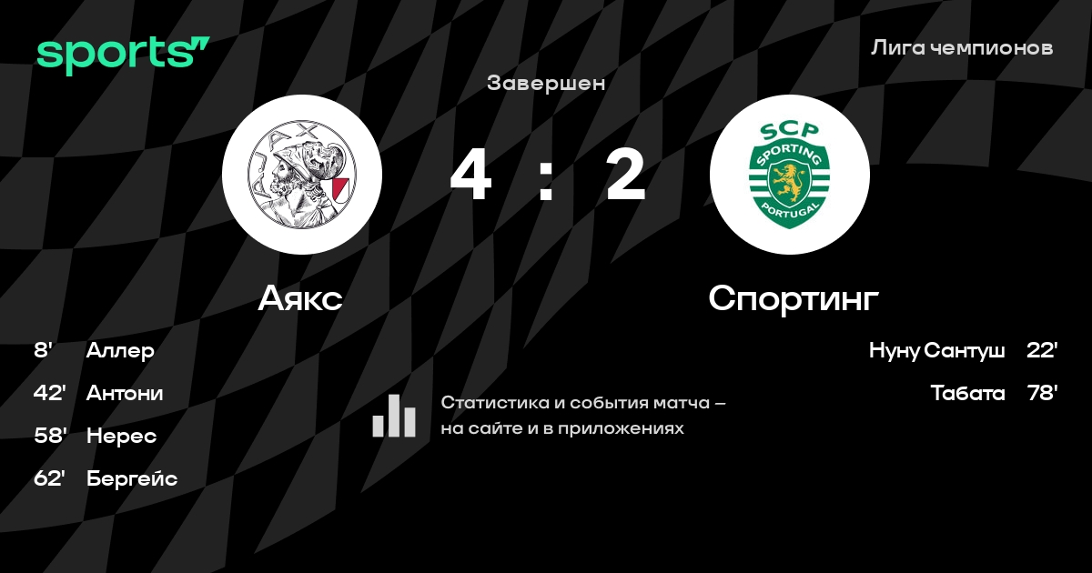 Результат прошлой игры в турнире «Лига чемпионов»: Спортинг – Боруссия Д 3:1. После 5 туров Спортинг набирает 9 очков и занимает 2 место в турнире. Лучший бомбардир команды – Педру Гонсалвеш: он забил 11 в 16 матчах. Спортинг побеждает в 3 последних матчах в рамках турнира «Лига чемпионов». В 3 последних матчах в турнире «Лига чемпионов» Спортинг обязательно забивает. В последних 5 играх Спортинг забивает 12 голов. В последних 5 играх Спортинг пропускает 3 голов.