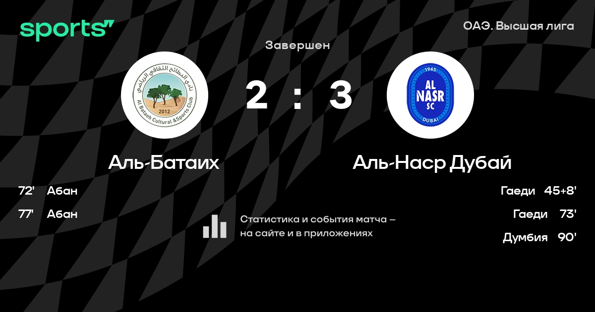 Результат прошлой игры в турнире «Высшая лига»: Аль-Иттихад Кальба – Аль-Батаих 1:3. После 8 туров Аль-Батаих набирает 6 очков и занимает 12 место в турнире. Лучший бомбардир команды – Даниэль Бесса: он забил 2 в 9 матчах. Аль-Батаих пропускает в 11 последних матчах в турнире «Высшая лига». В последних 5 играх Аль-Батаих забивает 5 голов. В последних 5 играх Аль-Батаих пропускает 8 голов.