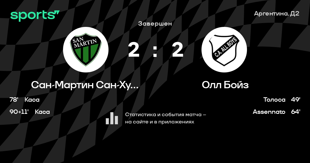 Результат прошлой игры в турнире «Примера B Насьональ»: Олл Бойз – Сан-Мартин Сан-Хуан 0:1. В 5 последних матчах в турнире «Примера B Насьональ» Сан-Мартин Сан-Хуан обязательно забивает. В последних 5 играх Сан-Мартин Сан-Хуан забивает 10 голов. В последних 5 играх Сан-Мартин Сан-Хуан пропускает 5 голов.