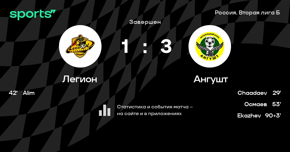 Результат прошлой игры в турнире «Вторая лига»: Динамо-2 Махачкала – Легион 2:2. После 28 туров Легион набирает 30 очков и занимает 5 место в турнире. Легион не может выиграть в 7 последних матчах в рамках турнира «Вторая лига». Легион пропускает в 7 последних матчах в турнире «Вторая лига». В последних 5 играх Легион забивает 7 голов. В последних 5 играх Легион пропускает 17 голов.