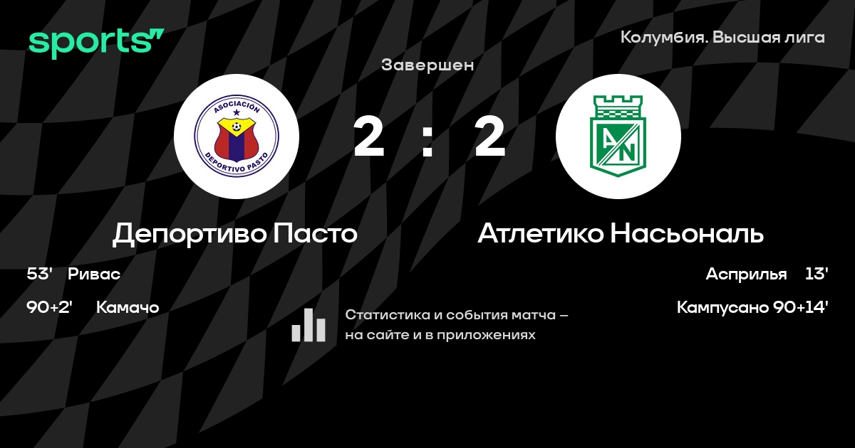 Результат прошлой игры в турнире «Примера A»: Агилас Дорадас – Депортиво Пасто 2:2. После 20 туров Депортиво Пасто набирает 29 очков и занимает 11 место в турнире. Лучший бомбардир команды – Y. Valois: он забил 8 в 16 матчах. Депортиво Пасто не может выиграть в 7 последних матчах в рамках турнира «Примера A». Депортиво Пасто пропускает в 7 последних матчах в турнире «Примера A». В последних 5 играх Депортиво Пасто забивает 5 голов. В последних 5 играх Депортиво Пасто пропускает 13 голов.