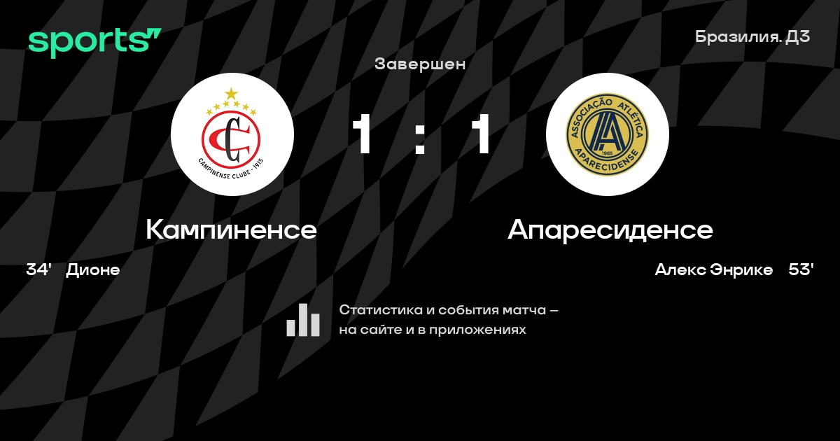 Результат прошлой игры в турнире «Бразилия. Д3»: АБС – Кампиненсе 1:0. После 3 туров Кампиненсе набирает 6 очков и занимает 6 место в турнире. Лучший бомбардир команды – Felipe: он забил 1 в 2 матчах. В последних 5 играх Кампиненсе забивает 5 голов. В последних 5 играх Кампиненсе пропускает 2 голов.