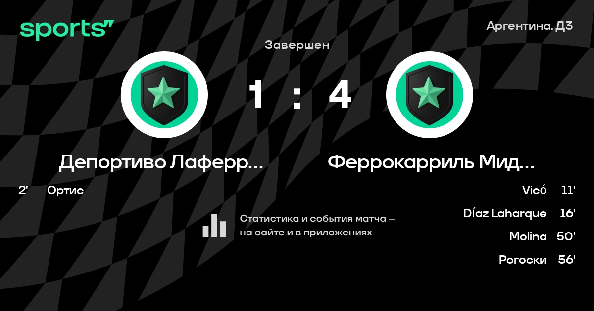 Результат прошлой игры в турнире «Примера B»: Экскурсьонистас – Депортиво Лаферрере 1:2. После 17 туров Депортиво Лаферрере набирает 28 очков и занимает 4 место в турнире. Лучший бомбардир команды – Лукас Гобервиль: он забил 7 в 34 матчах. Депортиво Лаферрере не проигрывает в 5 последних матчах в рамках турнира «Примера B». Феррокарриль Мидланд имеет в активе больше всех побед в турнире – 11. В 4 последних матчах в турнире «Примера B» Депортиво Лаферрере обязательно забивает. Депортиво Лаферрере пропускает в 3 последних матчах в турнире «Примера B». В последних 5 играх Депортиво Лаферрере забивает 7 голов. В последних 5 играх Депортиво Лаферрере пропускает 3 голов.