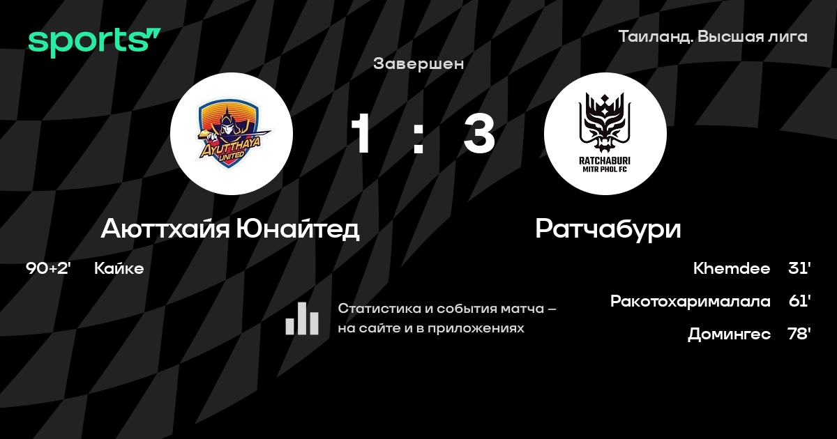 Результат прошлой игры в турнире «Премьер-лига»: Районг – Аюттхайя Юнайтед 2:2. После 10 туров Аюттхайя Юнайтед набирает 10 очков и занимает 10 место в турнире. Лучший бомбардир команды – Яшир Пинто: он забил 4 в 10 матчах. Аюттхайя Юнайтед не проигрывает в 4 последних матчах в рамках турнира «Премьер-лига». В 5 последних матчах в турнире «Премьер-лига» Аюттхайя Юнайтед обязательно забивает. Аюттхайя Юнайтед пропускает в 5 последних матчах в турнире «Премьер-лига». В последних 5 играх Аюттхайя Юнайтед забивает 10 голов. В последних 5 играх Аюттхайя Юнайтед пропускает 9 голов.
