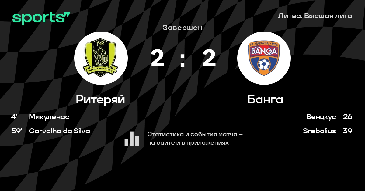 Результат прошлой игры в турнире «Высшая лига»: Паневежис – Ритеряй 0:1. После 33 туров Ритеряй набирает 24 очков и занимает 9 место в турнире. Лучший бомбардир команды – Мейнардас Микуленас: он забил 8 в 32 матчах. Ритеряй не проигрывает в 3 последних матчах в рамках турнира «Высшая лига». Ритеряй не пропускает в 3 последних матчах в турнире «Высшая лига». В последних 5 играх Ритеряй забивает 4 голов. В последних 5 играх Ритеряй пропускает 4 голов.