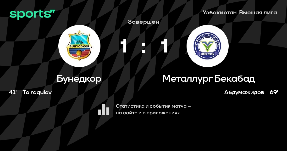 Результат прошлой игры в турнире «ПФЛ»: Нефтчи Фергана – Бунедкор 2:1. После 23 туров Бунедкор набирает 23 очков и занимает 12 место в турнире. Лучший бомбардир команды – Темурхужа Абдухоликов: он забил 6 в 24 матчах. В 6 последних матчах в турнире «ПФЛ» Бунедкор обязательно забивает. Бунедкор пропускает в 4 последних матчах в турнире «ПФЛ». В последних 5 играх Бунедкор забивает 8 голов. В последних 5 играх Бунедкор пропускает 7 голов.