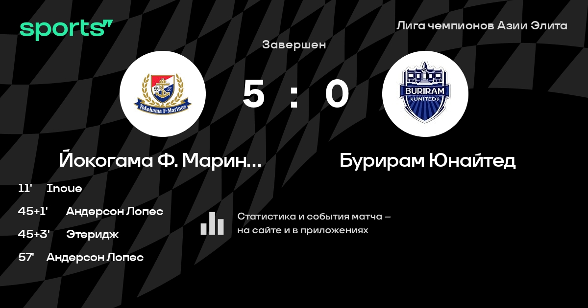 Результат прошлой игры в турнире «Лига чемпионов Азии Элита»: Шаньдун Тайшань – Йокогама Ф. Маринос 2:2. После 3 туров Йокогама Ф. Маринос набирает 4 очков и занимает 8 место в турнире. Лучший бомбардир команды – Андерсон Лопес: он забил 23 в 40 матчах. В 3 последних матчах в турнире «Лига чемпионов Азии Элита» Йокогама Ф. Маринос обязательно забивает. В последних 5 играх Йокогама Ф. Маринос забивает 6 голов. В последних 5 играх Йокогама Ф. Маринос пропускает 6 голов.