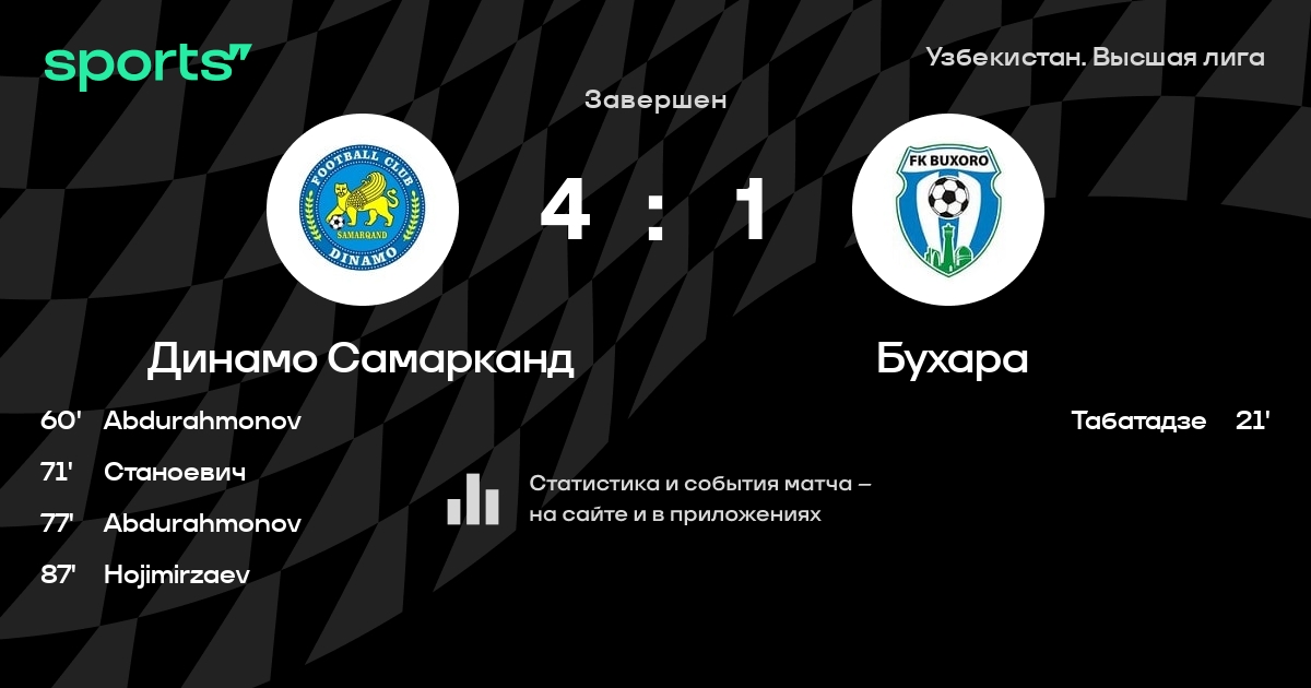 Результат прошлой игры в турнире «ПФЛ»: Термез Сурхан – Динамо Самарканд 0:2. После 23 туров Динамо Самарканд набирает 44 очков и занимает 4 место в турнире. Лучший бомбардир команды – A. Hojimirzaev: он забил 9 в 26 матчах. В 9 последних матчах в турнире «ПФЛ» Динамо Самарканд обязательно забивает. В последних 5 играх Динамо Самарканд забивает 8 голов. В последних 5 играх Динамо Самарканд пропускает 2 голов.