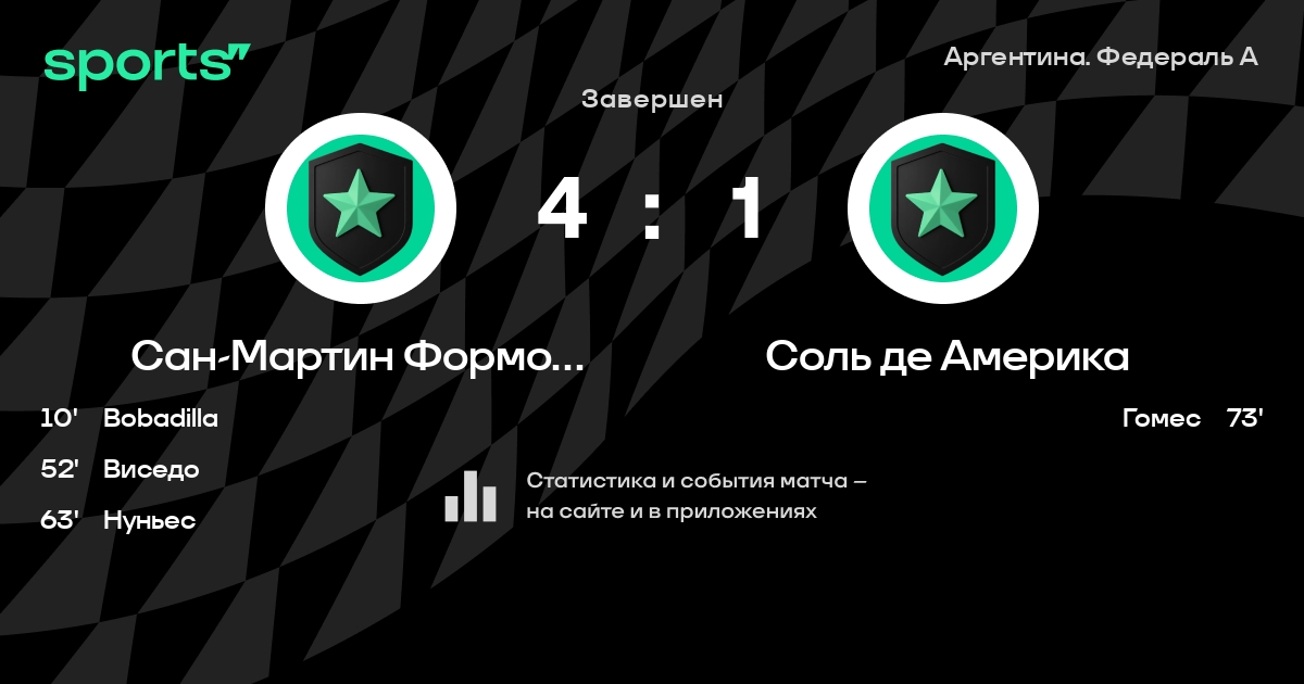 Результат прошлой игры в турнире «Торнео Федераль A»: Атлетико Рафаэла – Сан-Мартин Формоса 1:1. После 12 туров Сан-Мартин Формоса набирает 23 очков и занимает 3 место в турнире. Лучший бомбардир команды – Матиас Виседо: он забил 4 в 12 матчах. Сан-Мартин Формоса не проигрывает в 9 последних матчах в рамках турнира «Торнео Федераль A». В 6 последних матчах в турнире «Торнео Федераль A» Сан-Мартин Формоса обязательно забивает. В последних 5 играх Сан-Мартин Формоса забивает 11 голов. В последних 5 играх Сан-Мартин Формоса пропускает 2 голов.