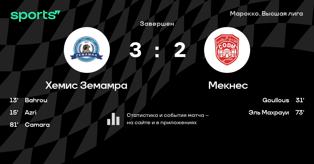 Результат прошлой игры в турнире «Высшая лига»: Хемис Земамра – Видад 0:0. После 15 туров Хемис Земамра набирает 25 очков и занимает 3 место в турнире. Лучший бомбардир команды – Z. Bahrou: он забил 3 в 10 матчах. Хемис Земамра не проигрывает в 6 последних матчах в рамках турнира «Высшая лига». Хемис Земамра не пропускает в 5 последних матчах в турнире «Высшая лига». В последних 5 играх Хемис Земамра забивает 3 голов. В последних 5 играх Хемис Земамра пропускает 0 голов.