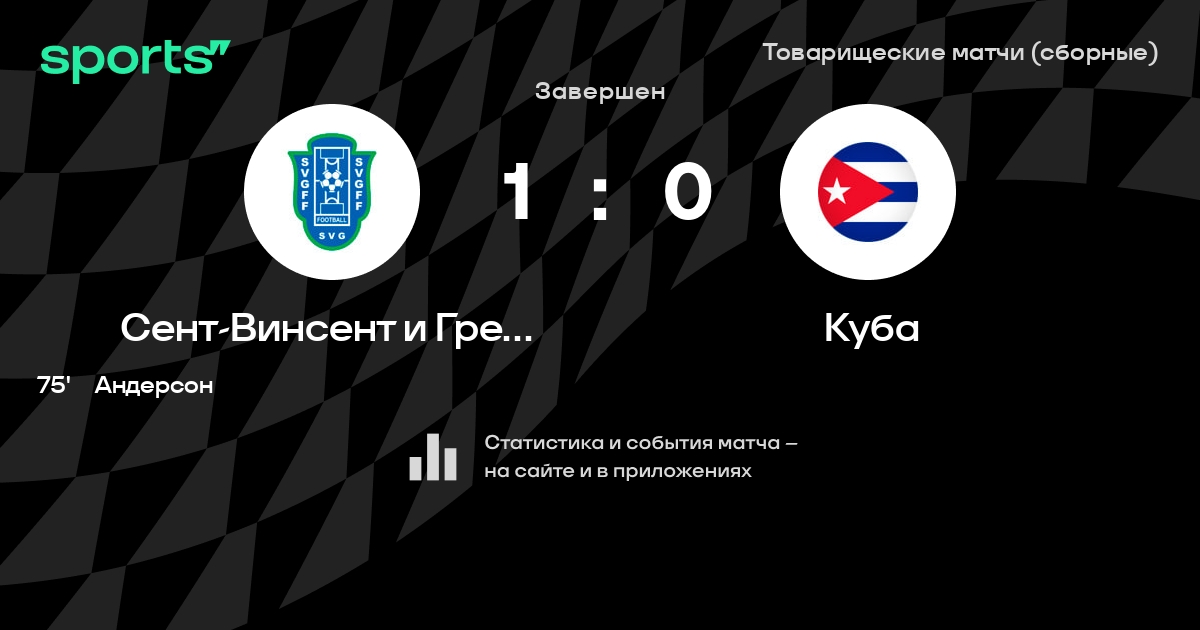 Результат прошлой игры в турнире «Товарищеские матчи (сборные)»: Сент-Винсент и Гренадины – Куба 7:0. Сент-Винсент и Гренадины не проигрывает в 8 последних матчах в рамках турнира «Товарищеские матчи (сборные)». В 13 последних матчах в турнире «Товарищеские матчи (сборные)» Сент-Винсент и Гренадины обязательно забивает. В последних 5 играх Сент-Винсент и Гренадины забивает 18 голов. В последних 5 играх Сент-Винсент и Гренадины пропускает 3 голов.