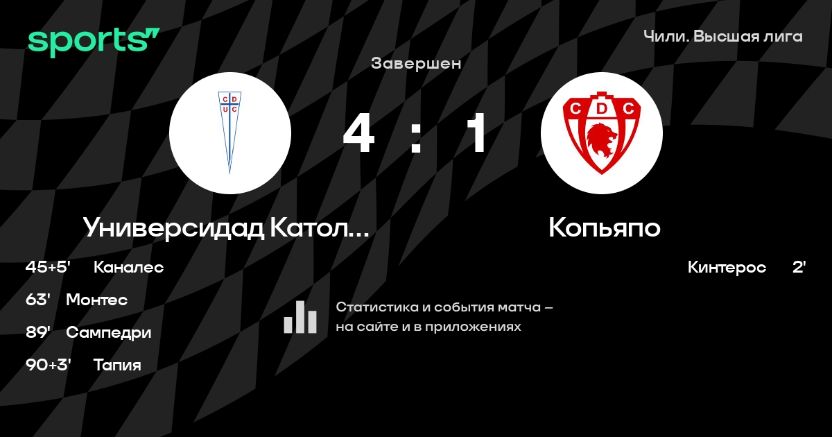 Результат прошлой игры в турнире «Примера»: Копьяпо – Унион Эспаньола 2:3. После 24 туров Копьяпо набирает 20 очков и занимает 16 место в турнире. Лучший бомбардир команды – Максимилиано Кинтерос: он забил 7 в 25 матчах. Копьяпо не может выиграть в 7 последних матчах в рамках турнира «Примера». В 4 последних матчах в турнире «Примера» Копьяпо обязательно забивает. Копьяпо пропускает в 7 последних матчах в турнире «Примера». В последних 5 играх Копьяпо забивает 8 голов. В последних 5 играх Копьяпо пропускает 12 голов.