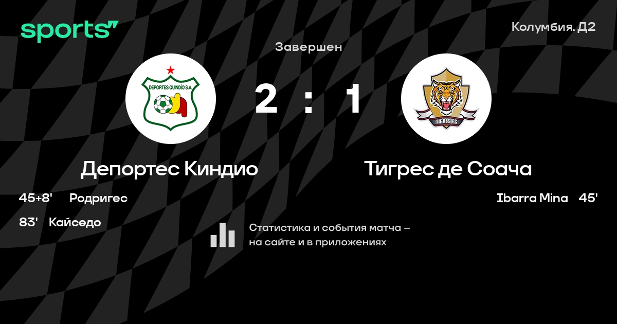 Результат прошлой игры в турнире «Примера Б»: Реал Сан-Андрес – Депортес Киндио 0:1. После 13 туров Депортес Киндио набирает 16 очков и занимает 10 место в турнире. Лучший бомбардир команды – Брандон Кайседо: он забил 6 в 23 матчах. В 5 последних матчах в турнире «Примера Б» Депортес Киндио обязательно забивает. В последних 5 играх Депортес Киндио забивает 11 голов. В последних 5 играх Депортес Киндио пропускает 5 голов.