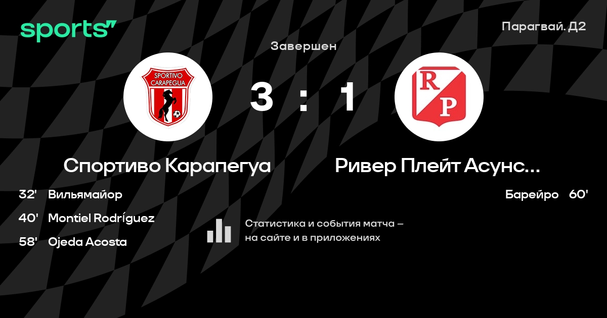 Результат прошлой игры в турнире «Сегунда»: Рубио Нью – Спортиво Карапегуа 1:0. После 27 туров Спортиво Карапегуа набирает 30 очков и занимает 13 место в турнире. Лучший бомбардир команды – J. Torales: он забил 7 в 26 матчах. Спортиво Карапегуа проигрывает в 3 последних матчах в рамках турнира «Сегунда». Спортиво Карапегуа пропускает в 11 последних матчах в турнире «Сегунда». В последних 5 играх Спортиво Карапегуа забивает 4 голов. В последних 5 играх Спортиво Карапегуа пропускает 10 голов.