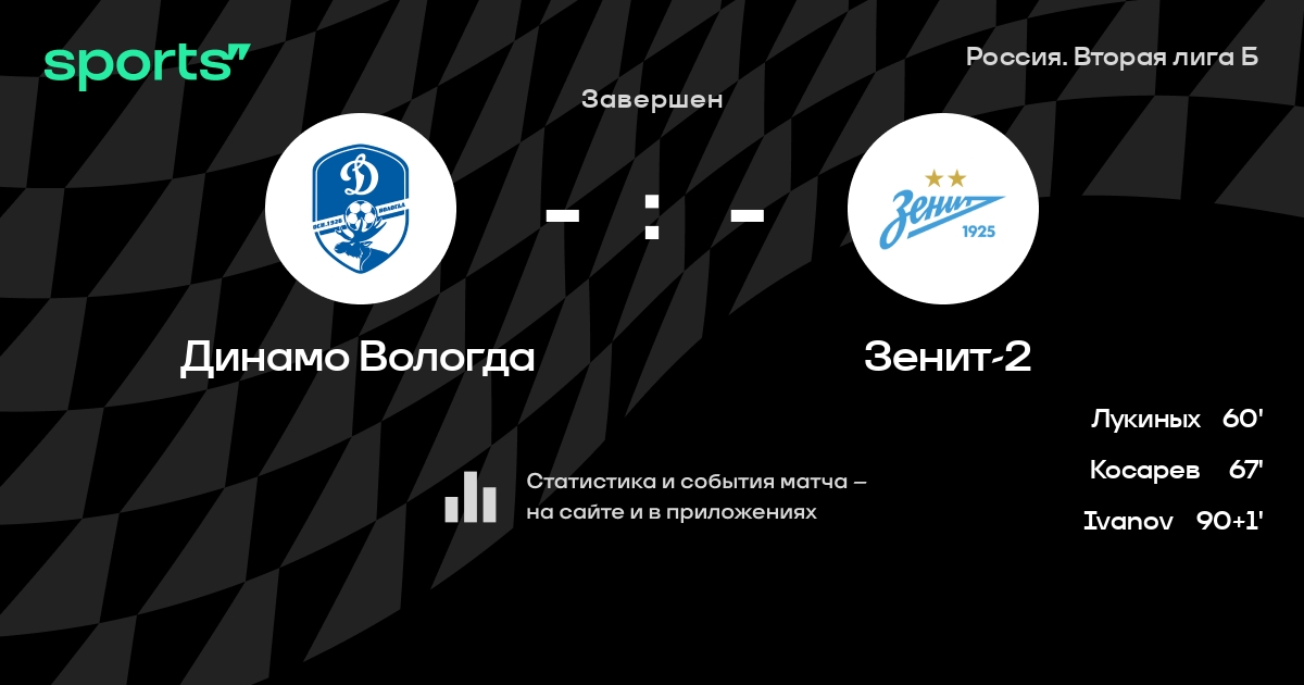 Результат прошлой игры в турнире «Вторая лига»: Космос – Динамо Вологда 1:2. После 22 туров Динамо Вологда набирает 49 очков и занимает 2 место в турнире. Лучший бомбардир команды – Никита Киреев: он забил 8 в 21 матчах. Зенит-2 имеет в активе больше всех побед в турнире – 20. В последних 5 играх Динамо Вологда забивает 10 голов. В последних 5 играх Динамо Вологда пропускает 5 голов.