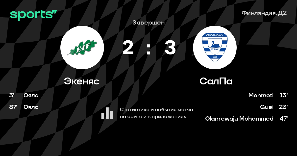 Результат прошлой игры в турнире «Первая лига»: ТПС – Экеняс 4:0. После 22 туров Экеняс набирает 31 очков и занимает 6 место в турнире. Лучший бомбардир команды – Саломо Ояла: он забил 14 в 25 матчах. Экеняс не может выиграть в 7 последних матчах в рамках турнира «Первая лига». В 3 последних матчах в турнире «Первая лига» Экеняс обязательно забивает. В последних 5 играх Экеняс забивает 3 голов. В последних 5 играх Экеняс пропускает 12 голов.