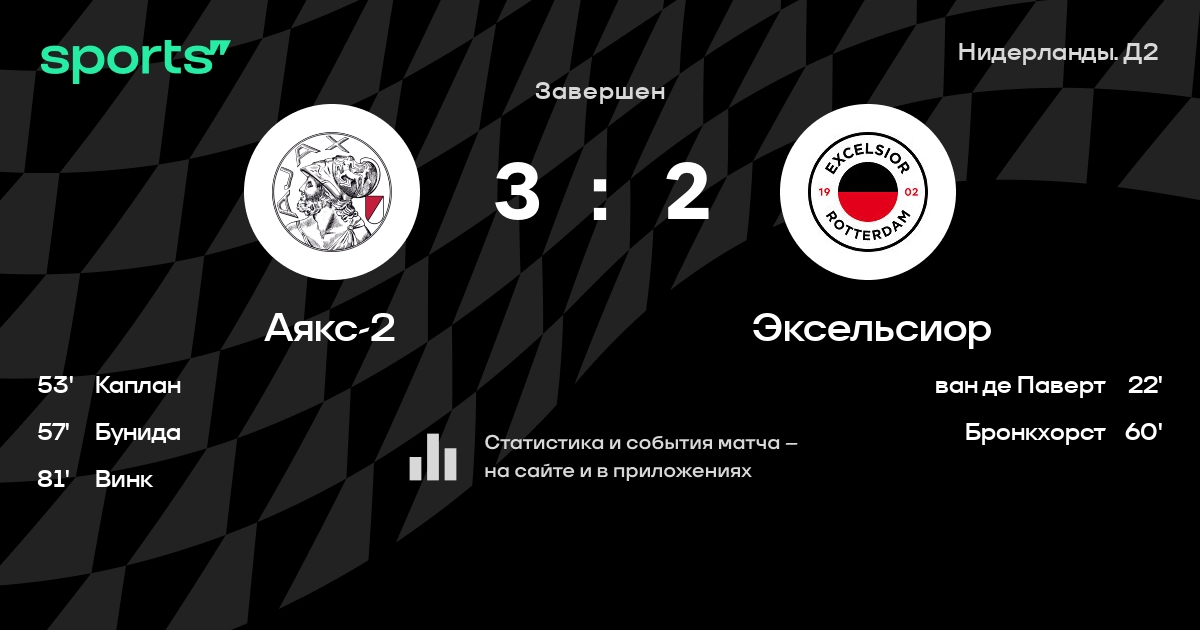 Результат прошлой игры в турнире «Первый дивизион»: Эксельсиор – Витесс 1:3. После 24 туров Эксельсиор набирает 45 очков и занимает 2 место в турнире. Лучший бомбардир команды – Ричи Оморова: он забил 10 в 21 матчах. В последних 5 играх Эксельсиор забивает 7 голов. В последних 5 играх Эксельсиор пропускает 9 голов.