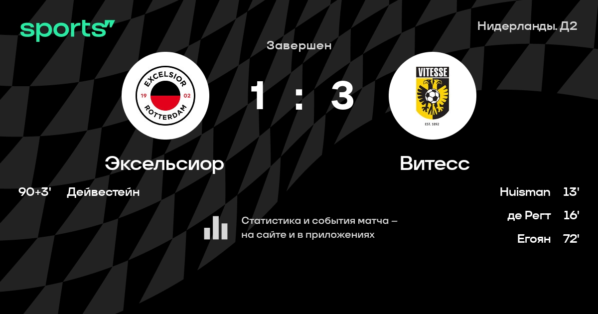 Результат прошлой игры в турнире «Первый дивизион»: Эксельсиор – Ден Хааг 1:0. После 23 туров Эксельсиор набирает 45 очков и занимает 2 место в турнире. Лучший бомбардир команды – Ричи Оморова: он забил 10 в 20 матчах. В последних 5 играх Эксельсиор забивает 7 голов. В последних 5 играх Эксельсиор пропускает 7 голов.