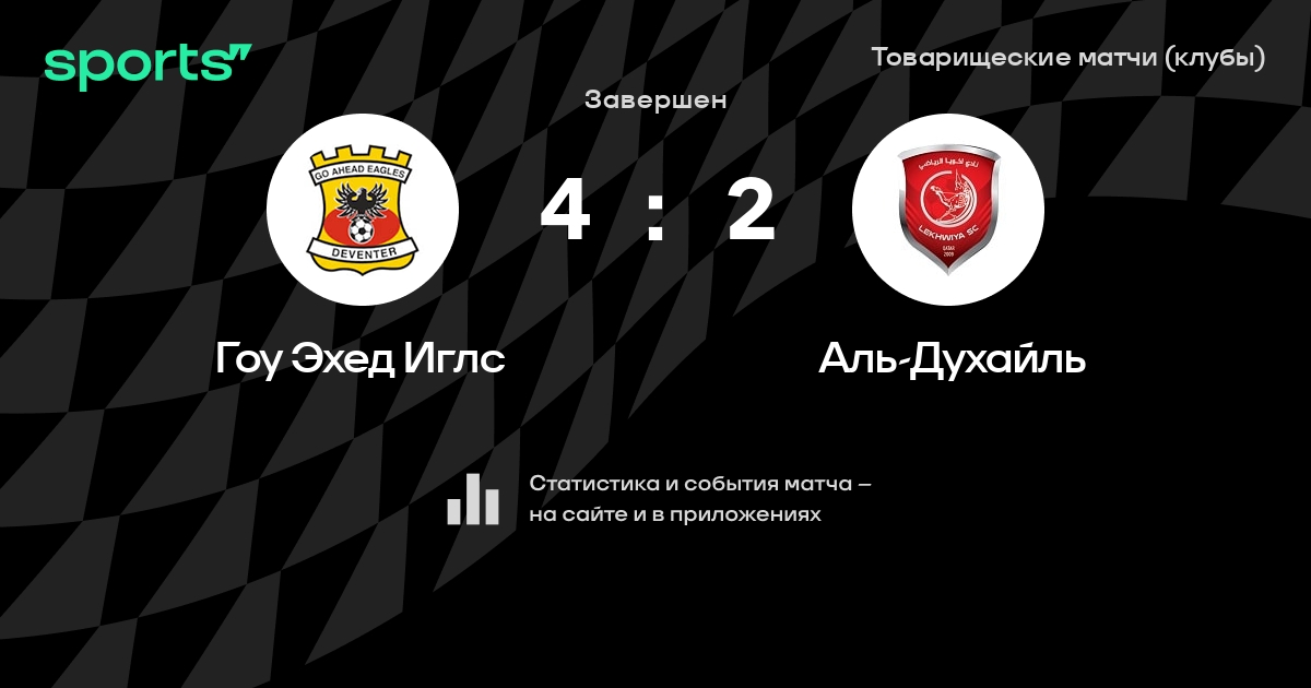 Результат прошлой игры в турнире «Товарищеские матчи (клубы)»: Гоу Эхед Иглс – Хелмонд Спорт 1:1. Гоу Эхед Иглс не проигрывает в 3 последних матчах в рамках турнира «Товарищеские матчи (клубы)». В 3 последних матчах в турнире «Товарищеские матчи (клубы)» Гоу Эхед Иглс обязательно забивает. В последних 5 играх Гоу Эхед Иглс забивает 8 голов. В последних 5 играх Гоу Эхед Иглс пропускает 7 голов.