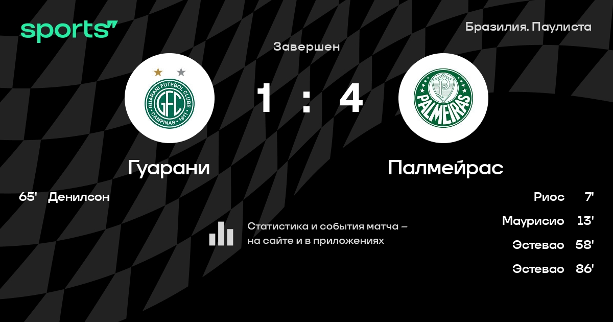 Результат прошлой игры в турнире «Лига Паулиста»: Мирассол – Гуарани 3:2. После 5 туров Гуарани набирает 7 очков и занимает 1 место в турнире. Лучший бомбардир команды – Жеоване Сантос: он забил 2 в 5 матчах. В последних 5 играх Гуарани забивает 6 голов. В последних 5 играх Гуарани пропускает 4 голов.