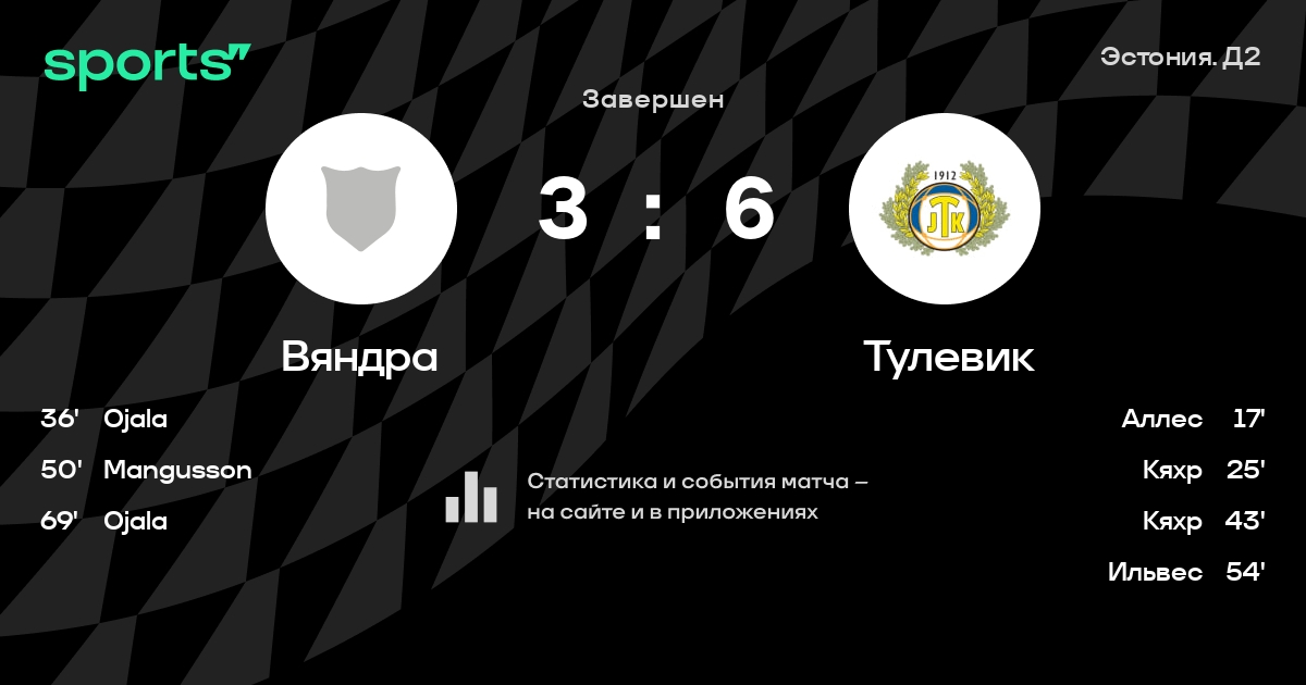 Oja - Аллик, Henn, Кяхр, Юхкам, Саар - Аллес, Маар, Ильвес, Taar, Ланг - Запасные: , Roog, Пейпс, Teor