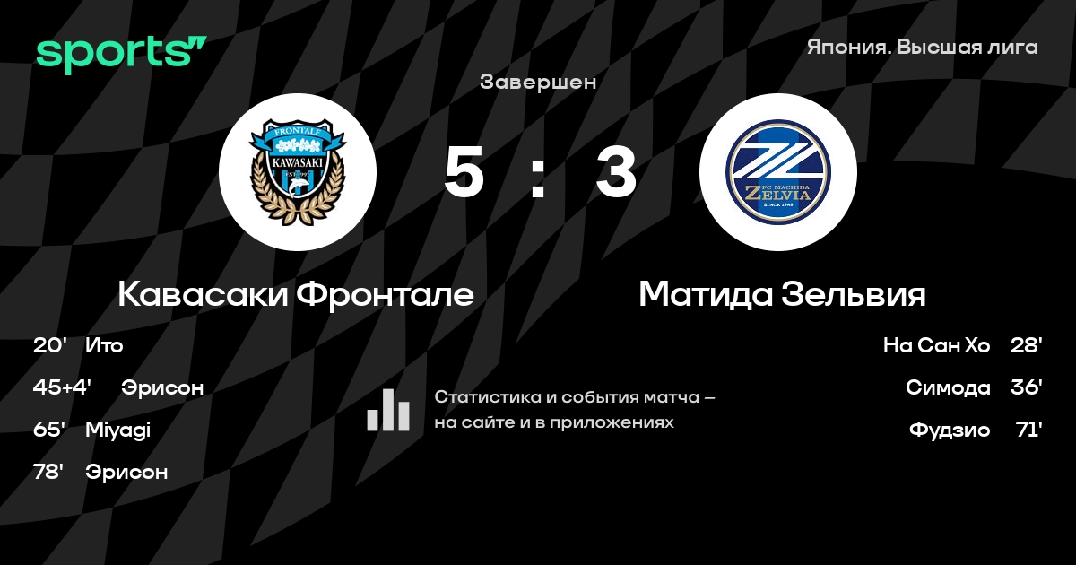 Результат прошлой игры в турнире «Джей-лига 1»: Нагоя Грампус – Кавасаки Фронтале 3:4. После 27 туров Кавасаки Фронтале набирает 42 очков и занимает 8 место в турнире. Лучший бомбардир команды – Эрисон: он забил 8 в 19 матчах. В 5 последних матчах в турнире «Джей-лига 1» Кавасаки Фронтале обязательно забивает. Кавасаки Фронтале пропускает в 8 последних матчах в турнире «Джей-лига 1». В последних 5 играх Кавасаки Фронтале забивает 8 голов. В последних 5 играх Кавасаки Фронтале пропускает 11 голов.