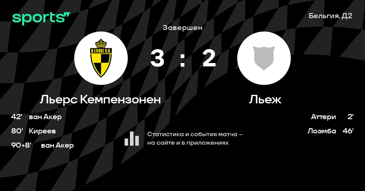 Результат прошлой игры в турнире «Первый дивизион»: Берсхот – Льерс Кемпензонен 2:1. После 25 туров Льерс Кемпензонен набирает 25 очков и занимает 14 место в турнире. Лучший бомбардир команды – Тибо ван Акер: он забил 8 в 26 матчах. Льерс Кемпензонен пропускает в 11 последних матчах в турнире «Первый дивизион». В последних 5 играх Льерс Кемпензонен забивает 8 голов. В последних 5 играх Льерс Кемпензонен пропускает 10 голов.