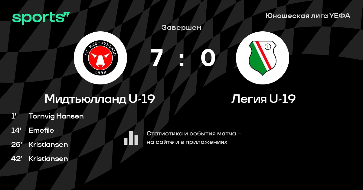 Результат прошлой игры в турнире «Юношеская лига УЕФА»: Легия U-19 – Мидтьюлланд U-19 0:2. Мидтьюлланд U-19 побеждает в 3 последних матчах в рамках турнира «Юношеская лига УЕФА». В 4 последних матчах в турнире «Юношеская лига УЕФА» Мидтьюлланд U-19 обязательно забивает. Мидтьюлланд U-19 не пропускает в 3 последних матчах в турнире «Юношеская лига УЕФА». В последних 5 играх Мидтьюлланд U-19 забивает 12 голов. В последних 5 играх Мидтьюлланд U-19 пропускает 2 голов.