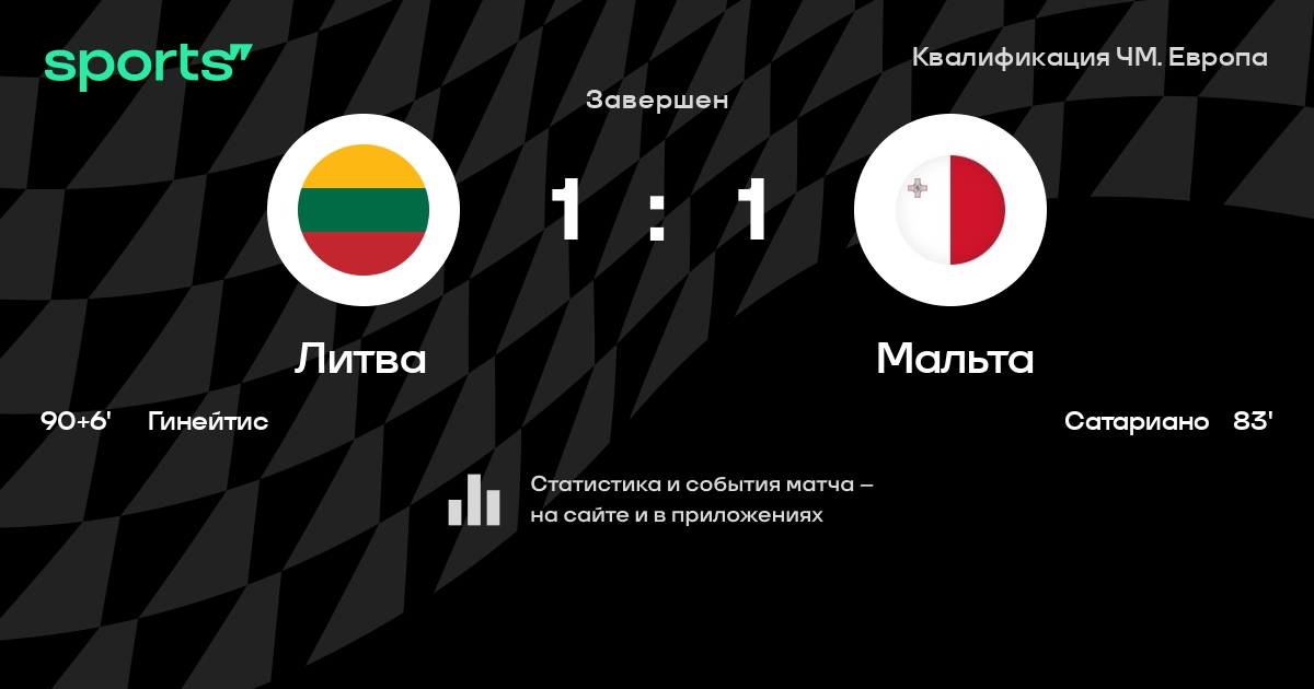 Результат прошлой игры в турнире «Квалификация ЧМ»: Мальта – Литва 0:0. После 3 туров Литва набирает 2 очков и занимает 4 место в турнире. Лучший бомбардир команды – Гвидас Гинейтис: он забил 2 в 16 матчах. Литва не может выиграть в 3 последних матчах в рамках турнира «Квалификация ЧМ». В последних 5 играх Литва забивает 2 голов. В последних 5 играх Литва пропускает 9 голов.