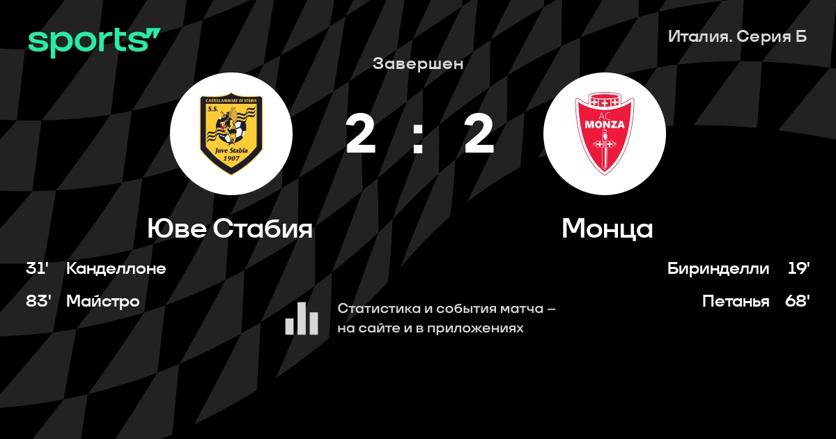 Результат прошлой игры в турнире «Серия B»: Сампдория – Юве Стабия 1:0. После 12 туров Юве Стабия набирает 17 очков и занимает 10 место в турнире. Лучший бомбардир команды – Леонардо Канделлоне: он забил 3 в 11 матчах. Монца имеет в активе больше всех побед в турнире – 9. В последних 5 играх Юве Стабия забивает 5 голов. В последних 5 играх Юве Стабия пропускает 6 голов.