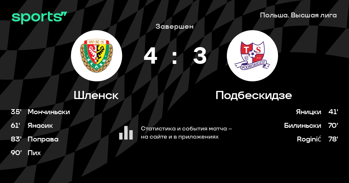 Шленск – Подбескидзе: Шленск побеждает в 4 последних очных матчах.