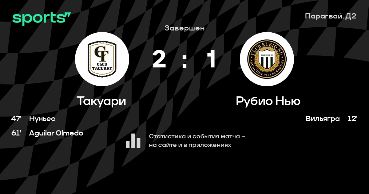 Результат прошлой игры в турнире «Сегунда»: Пасторео – Такуари 0:0. После 29 туров Такуари набирает 35 очков и занимает 11 место в турнире. Лучший бомбардир команды – Диего Годой: он забил 4 в 17 матчах. Такуари не может выиграть в 6 последних матчах в рамках турнира «Сегунда». Рубио Нью имеет в активе больше всех побед в турнире – 17. В 3 последних матчах в турнире «Сегунда» Такуари обязательно забивает. В последних 5 играх Такуари забивает 2 голов. В последних 5 играх Такуари пропускает 7 голов.