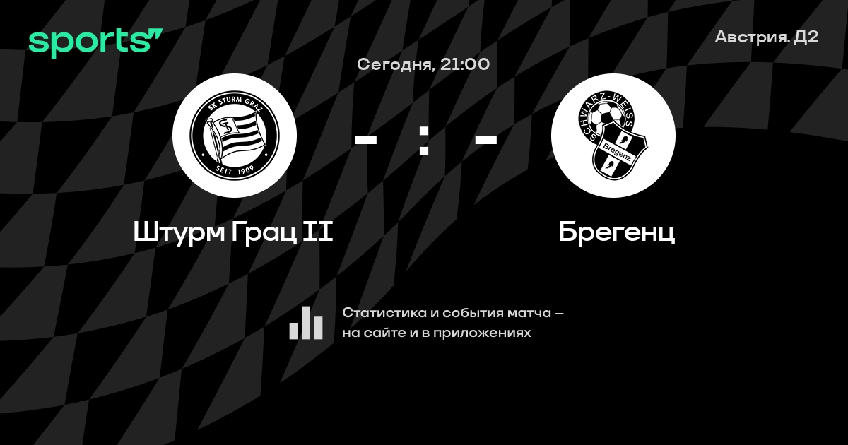 Результат прошлой игры в турнире «Вторая бундеслига»: Санкт-Пельтен – Штурм Грац II 4:0. После 8 туров Штурм Грац II набирает 2 очков и занимает 16 место в турнире. Лучший бомбардир команды – R. Osayantin: он забил 3 в 8 матчах. Штурм Грац II проигрывает в 5 последних матчах в рамках турнира «Вторая бундеслига». Штурм Грац II пропускает в 17 последних матчах в турнире «Вторая бундеслига». В последних 5 играх Штурм Грац II забивает 4 голов. В последних 5 играх Штурм Грац II пропускает 12 голов.