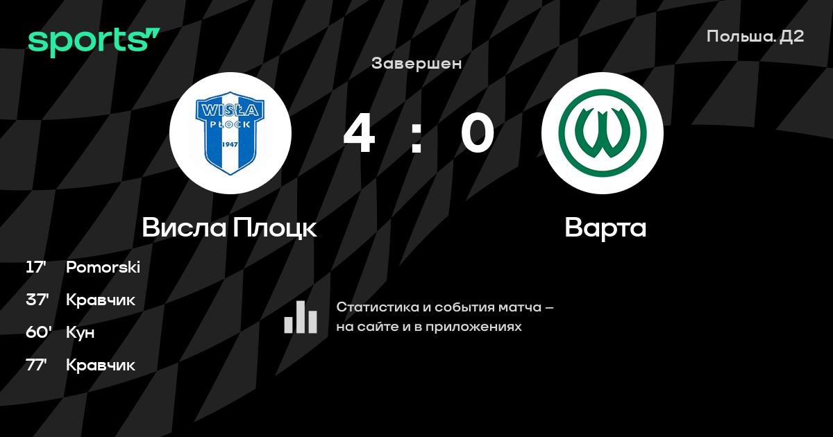 Результат прошлой игры в турнире «Первая лига»: Варта – Термалика 0:1. После 18 туров Варта набирает 19 очков и занимает 13 место в турнире. Лучший бомбардир команды – Кацпер Михальски: он забил 3 в 18 матчах. В последних 5 играх Варта забивает 3 голов. В последних 5 играх Варта пропускает 5 голов.