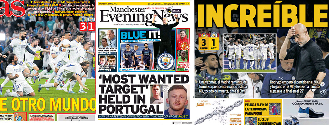 Вы это видели? / «С другой планеты», «Невероятные!», «Боже, спустись и объясни!» – грандиозный полуфинал «Реала» с «Сити» на обложках газет