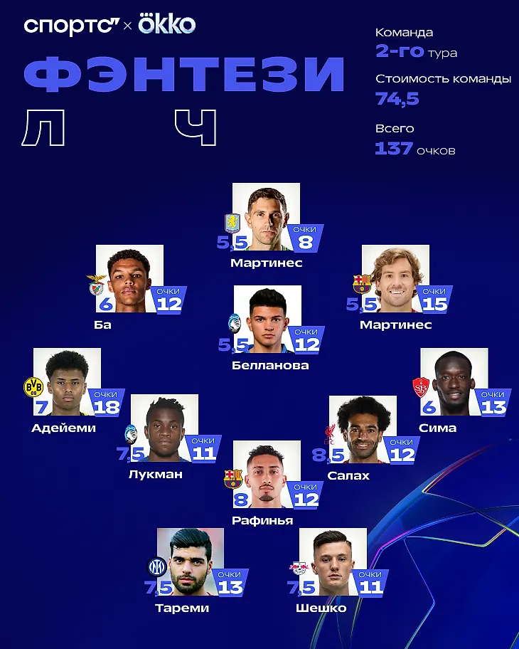02:10 Адейеми – самый результативный в фэнтези-туре ЛЧ с 18 очками, защитник «Барсы» Мартинес – 2-й (15), у Тареми из «Интера» и Симы из «Бреста» по 13|0